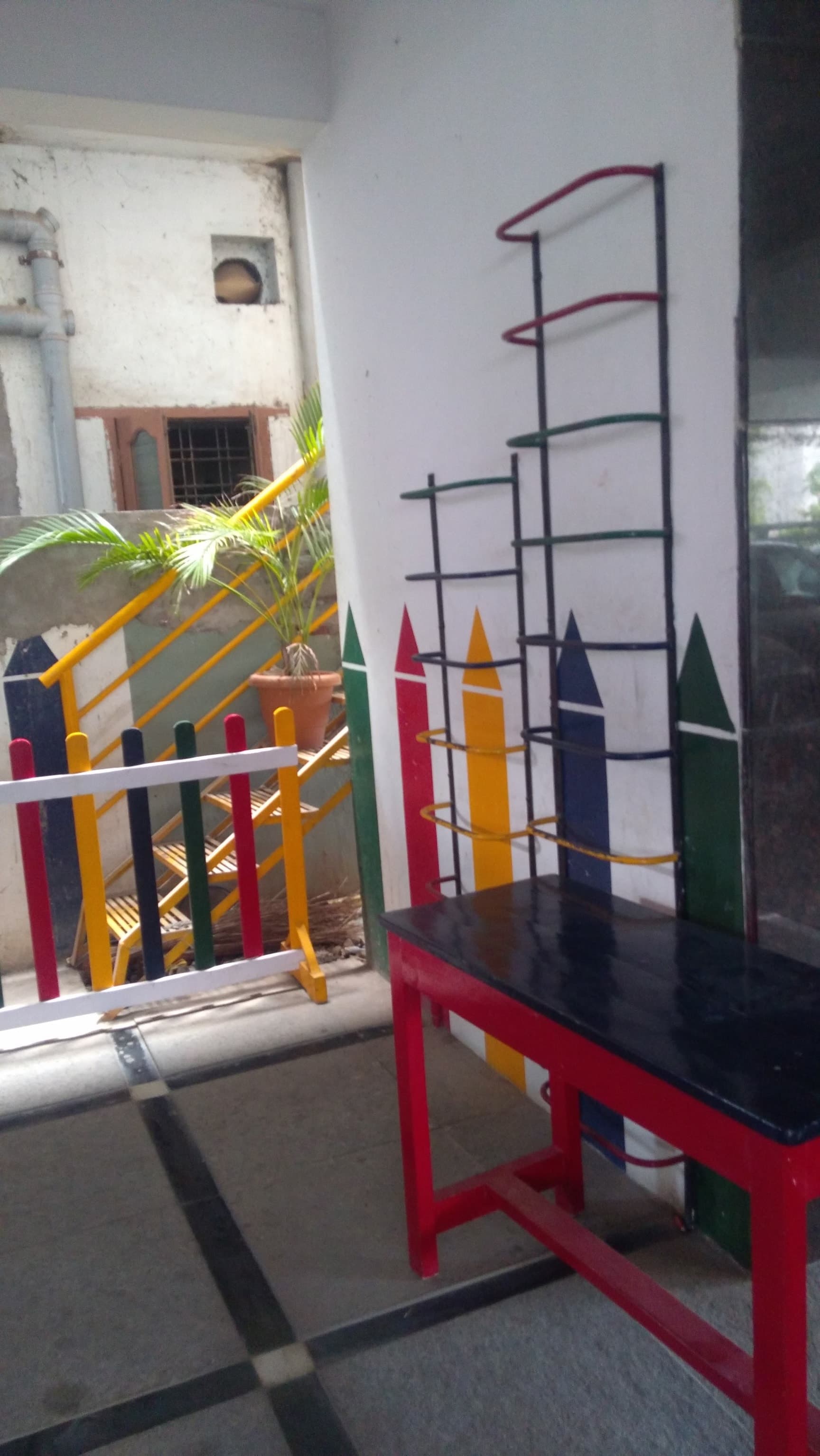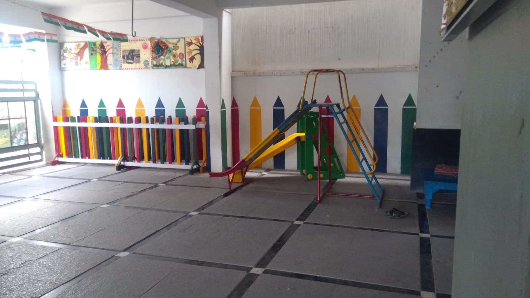 The classrooms are colourful and child-friendly, with visible outdoor play space.