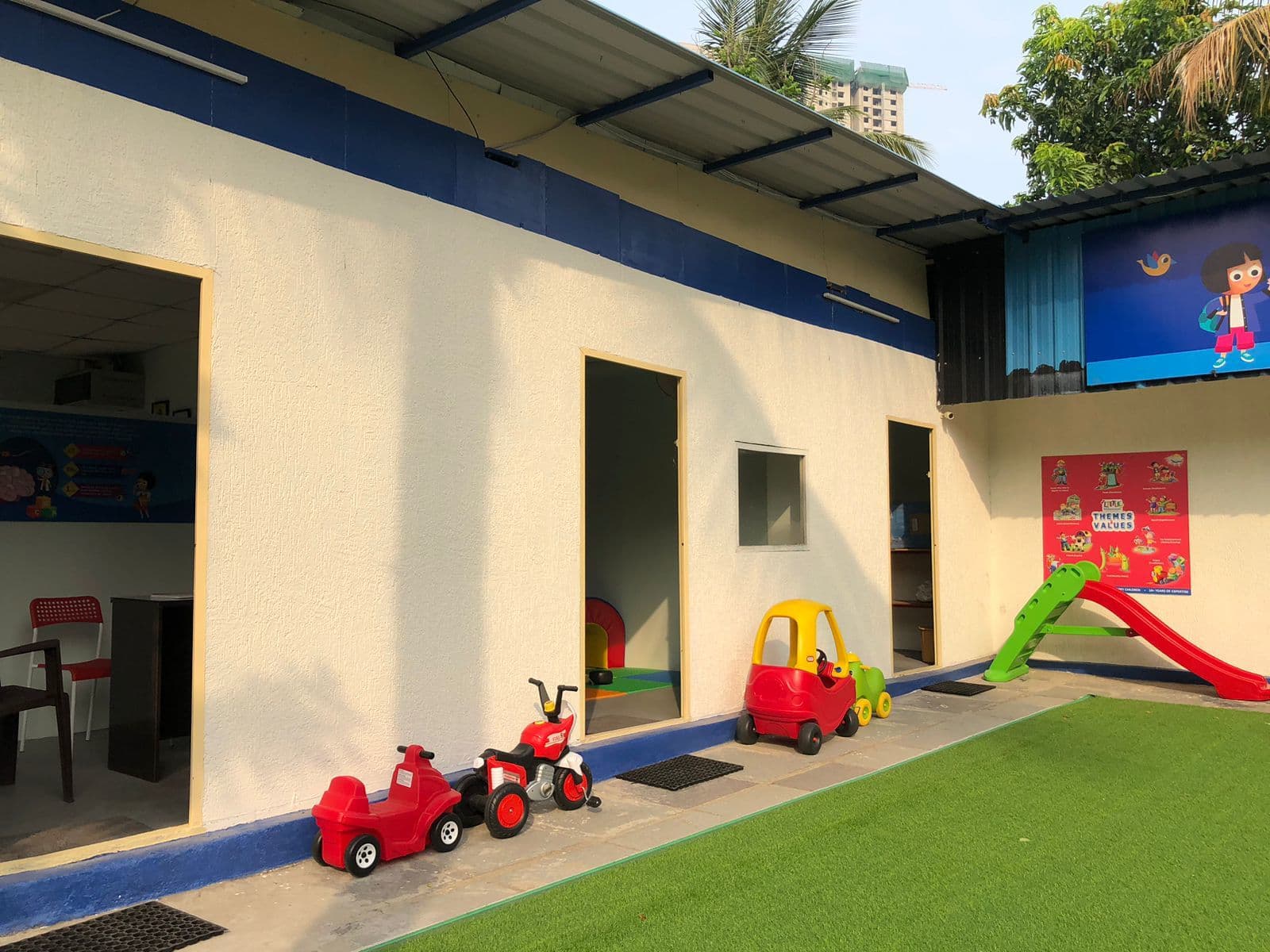 Clean, colourful classrooms and safe play areas are often highlighted.
